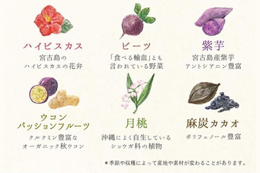 プレーン、マンゴー、ハイビスカス、ビーツ、紫芋、パッション&ウコン、月桃&抹茶、麻炭&カカオの8つのお味。